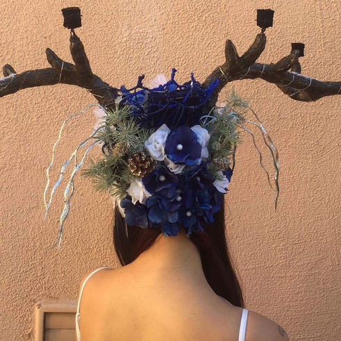This wearable piece is called Aura Antlers. They are made of wire, aluminum foil, and plaster, and can light on fire or become illuminated with purple LEDs. This work symbolized a visual aura where I can draw positivity to myself through the energy of a flame.